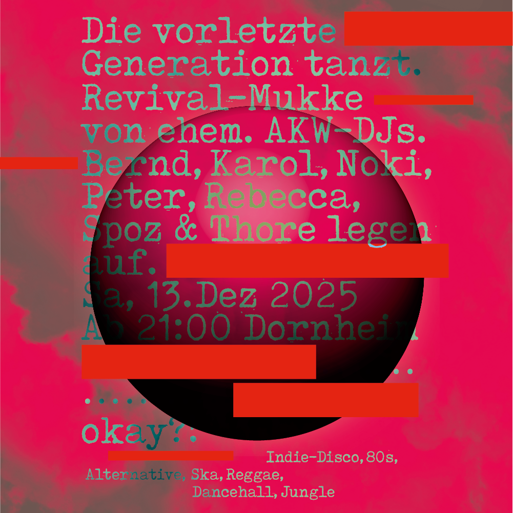 Das AKW war über drei Jahrzehnte lang weit mehr als Kneipe, Biergarten und Disko – es war politischer Freiraum, musikalisches Labor, Zufluchtsort und Heimat für alle, die anders dachten, fühlten und tanzten. Im Dornheim lebt das AKW musikalisch weiter: Auf zwei Floors gibt’s wieder eine fein kuratierte Mische abseits des Ü40-Mainstreams. Diesmal Indie-Disco, 80s, Alternative, Ska, Reggae, Dancehall & Jungle, kredenzt von den DJs Bernd, Karol, Noki (HiGrade Sound), Peter, Rebecca, Spoz & Thore.